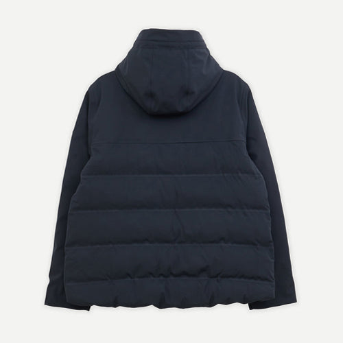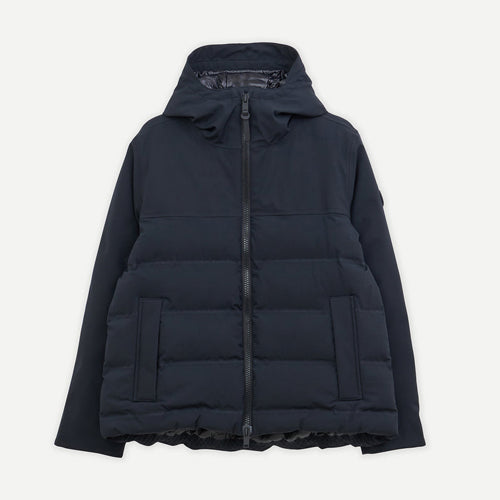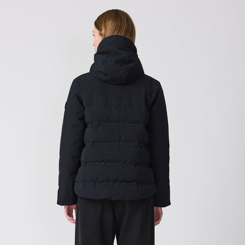 Chaqueta plumífero TANTÄ en color negro. Confeccionada en el emblemático tejido Softshell impermeable y acolchado con aislamiento ligero, transpirable y sin plumas. Modelo de corte evasé combina a la perfección comodidad, ligereza y volumen. Sus costuras completamente selladas garantizan una protección total contra el agua, mientras que las mangas, capucha y los paneles superiores delanteros y traseros en tejido liso aportan un elegante contraste. El diseño se remata con una cremallera frontal impermeable de doble cursor y detalles en tonos a juego para un acabado pulido y moderno.