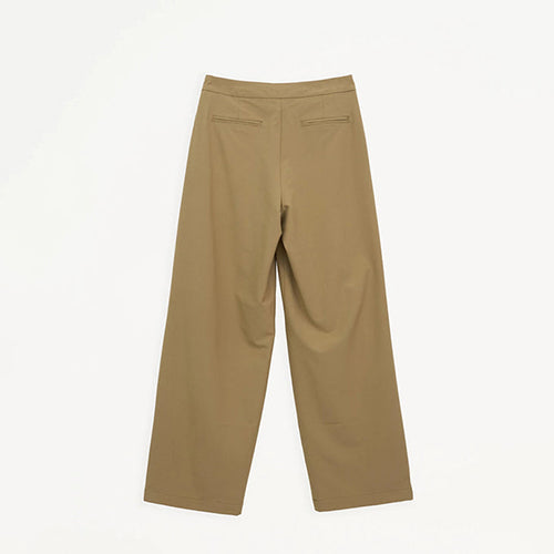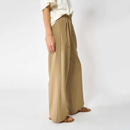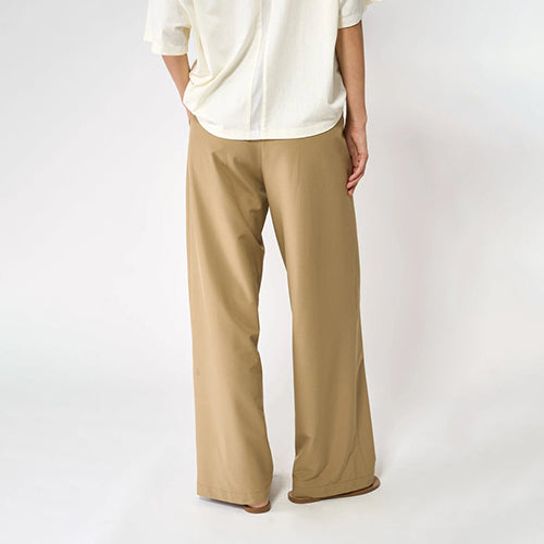 Pantalón sastre de corte holgado de la marca TANTÄ en color camel. Confeccionado en tejido 4-ways stretch de secado rápido. El material es fluido y elegante, y la pinzas delanteras aportan un volumen adicional y una silueta holgada.