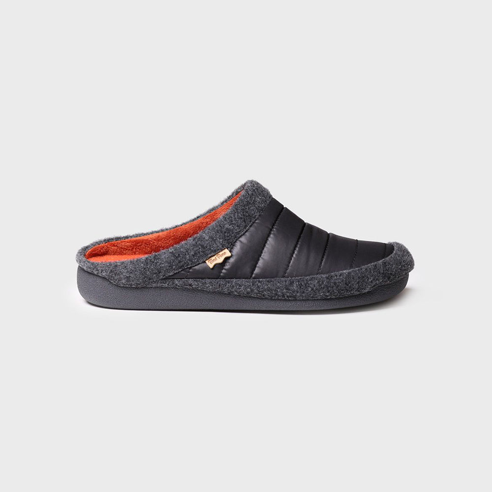 Slippers tipo zueco para hombre de la marca Toni Pons en color negro. Calzado homewear fabricado en combinación de tejido acolchado y fieltro. La suela es plana y tiene 1,5 cm de grosor. Suela de goma. Cuenta con plantilla extraíble con una cuña de 2 cm de grosor en la parte del talón, dando al pie una altura total de 3,5 cm. Lleva un forro interior en tejido para una mayor calidez en los días más fríos.