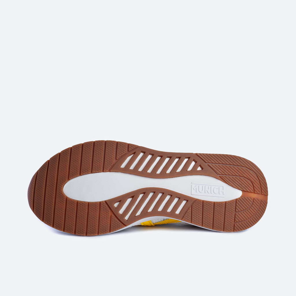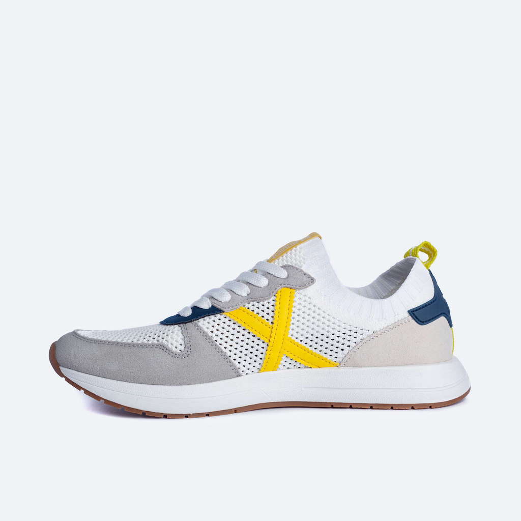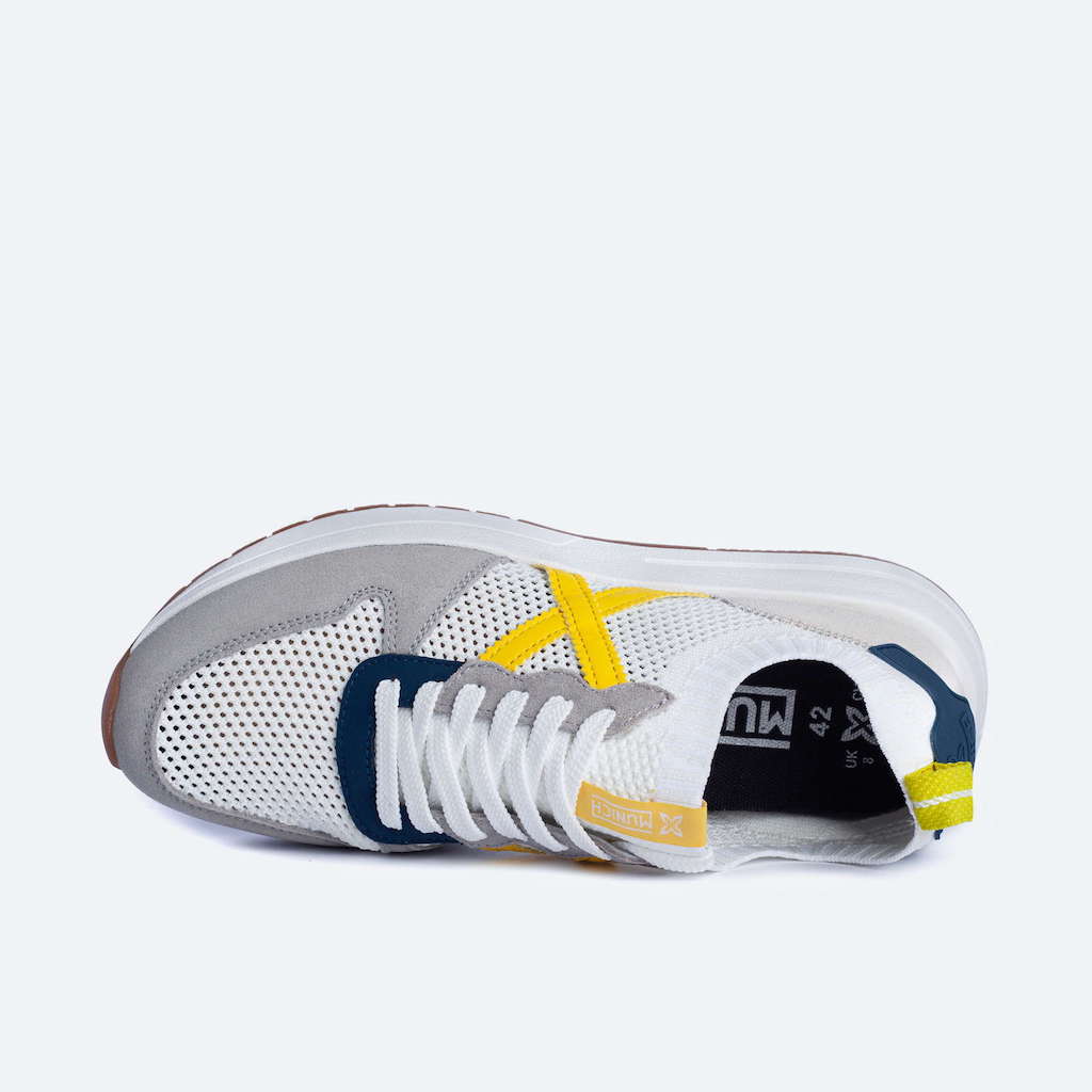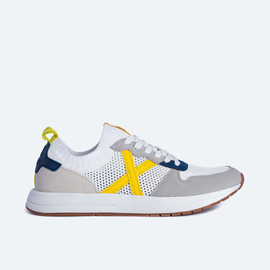 Deportiva Munich con tejido rejilla elástico en color blanco. Detalles en color azul y amarillo. Contraste de materiales en el corte destacando el tejido de punto. Cordonera con seis pasados. Tirador en la parte trasera. Acabado con elástico. Comfy silhouette.