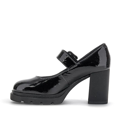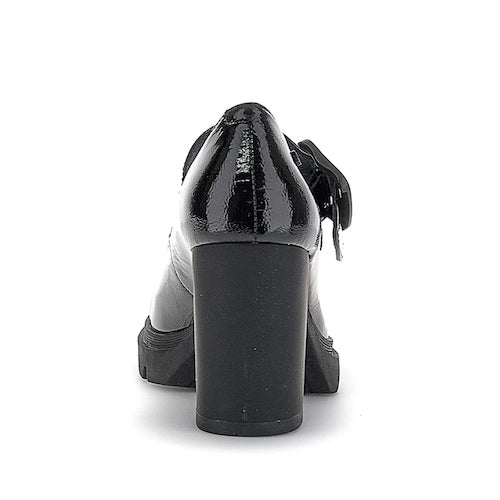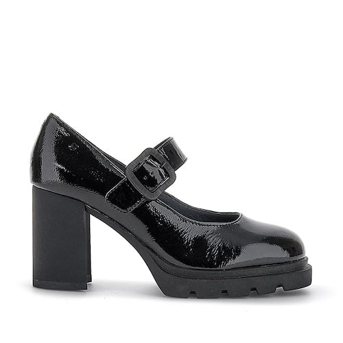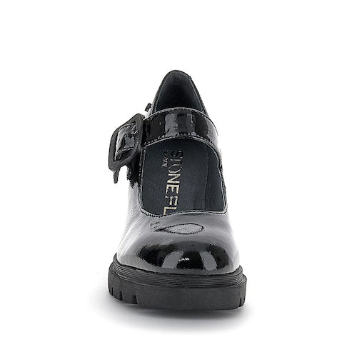Zapato estilo merceditas de tacón alto de la marca Stonefly. Fabricado en piel charol color negro. Plantilla de piel no extraíble. Cierre mediante tira con hebilla ajustable. Puntera redondeada.  Tacón ancho y suela dentada de goma. Un modelo clásico, súper-ligero con un estilo muy actual.