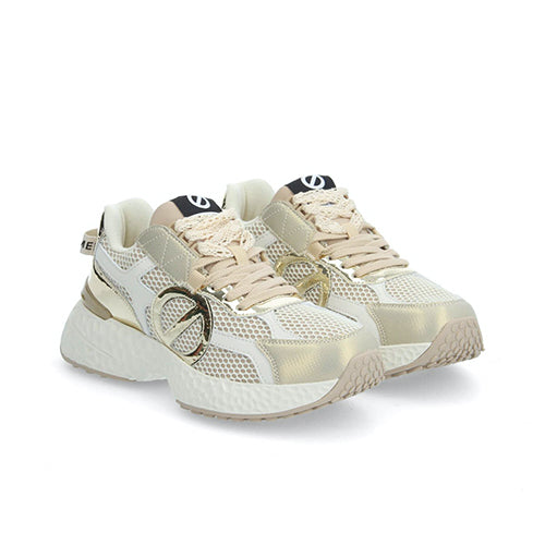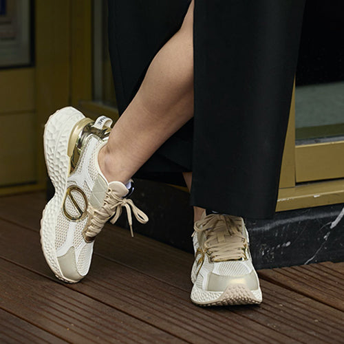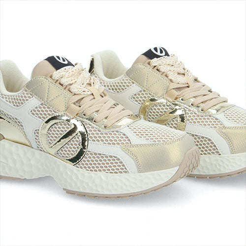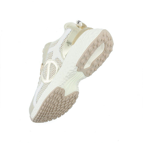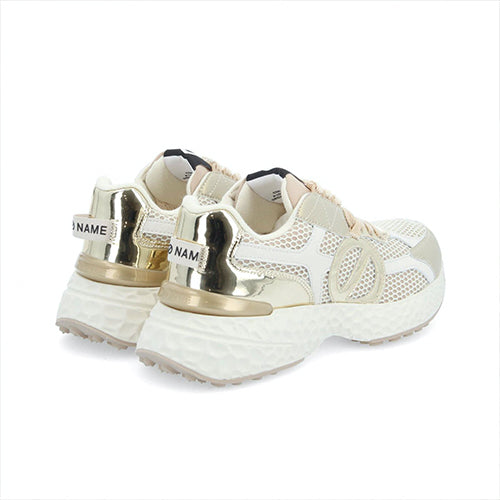 Deportiva de cordones de la marca NO NAME. Fabricada en textil con un 60% poliéster reciclado certificado GRS, combina piezas de corte en piel color blanco. Detalle de anagrama en los laterales en color platino metalizado. Suela volumen EVA en color blanco con tacos, extremadamente cómoda. Plantilla y suela recicladas para una zapatilla con un impacto ambiental limitado. Forro de algodón y poliéster orgánico con certificación GOTS. Plantilla extraíble de algodón orgánico con certificación GOTS. Lengüeta en el talón con logotipo.
