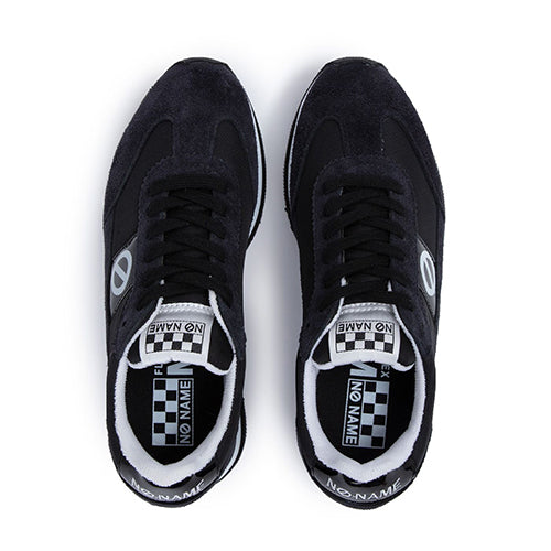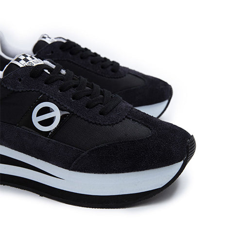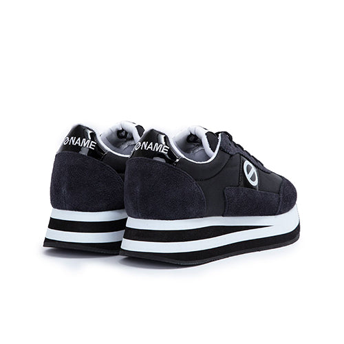 Deportiva con plataforma de la marca NO NAME. Fabricada en combinación de materiales en textil y sintético, con piezas de corte en piel nobuk. Modelo en color negro. Detalle de logo en los laterales. Contrafuerte en charol negro con nombre de marca en negativo. Forro de poliéster orgánico que garantiza una comodidad inigualable. Plantilla extraíble de algodón orgánico. Piso bicolor en blanco y negro. Flexible entresuela de EVA y suela de goma.