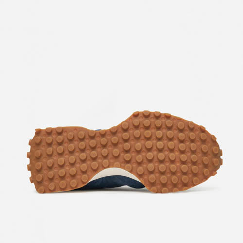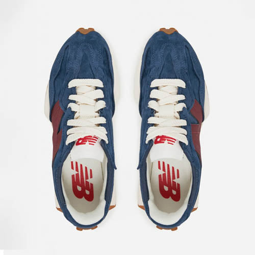 Deportiva New Balance modelo 327. Fabricada en ante color azul. Modelo que aporta la silueta emblemática de los años 70, al tiempo que añade detalles contemporáneos como el logotipo N en color burdeos y de gran tamaño, para renovar un clásico de todos los tiempos. Diseño más angular de la más que probada silueta de cuña, su marca «N» asimétrica de gran tamaño y una suela con tacos envolvente inspirada en los caminos, la 327 es una digna heredera del running. Entresuela ensanchada. Detalle de marca con el texto “New Balance” en la parte interior del modelo. Talón de goma y ojales partidos.