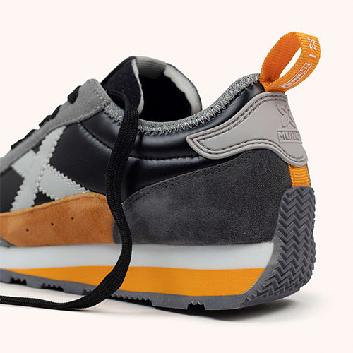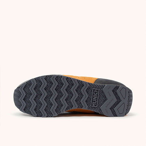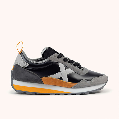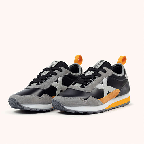 Deportiva Munich con cordones. Modelo Um inspirado en el heritage más setentero de la marca. Fabricada en combinación de piezas de corte en colores gris y ocre con textil en color gris. Contrafuerte y símbolo de marca, situado en el lateral, en color gris claro. Suela EVA + goma.