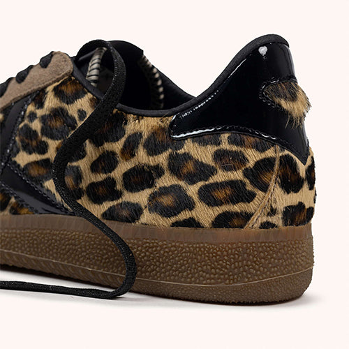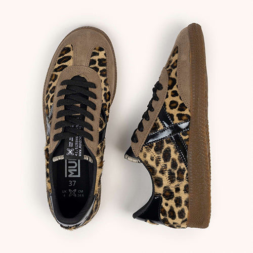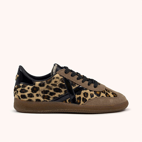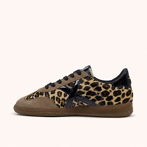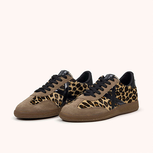 Deportiva Munich en animal print. Fabricado en piezas de corte de piel en nobuk taupe y pelo. Contrafuerte y símbolo de marca en charol negro. Cierre mediante cordones. Suela de goma.