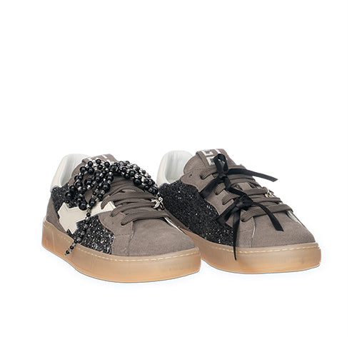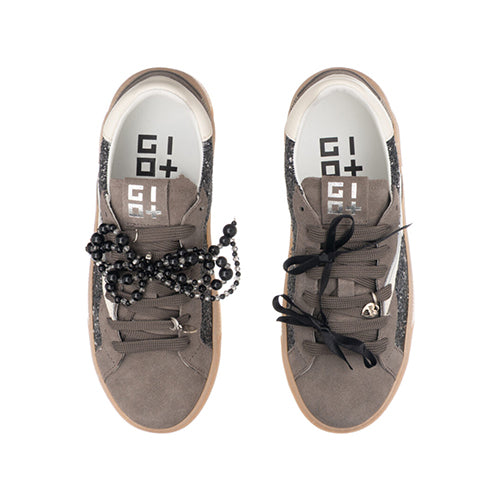Deportiva de la marca Gio+. Fabricada en piezas de corte nobuk color gris y tejido brillante. Detalle en lateral exterior en color piel blanco. Puntera y lengüeta en piel nobuk al tono. Contrafuerte en piel blanco. Cierre mediante cordones en color gris. Detalles tipo charms de quita y pon en forma de perlitas y lazos de raso en color negro. Suela de plataforma en goma ligera beige. El interior está forrado en piel. Plantilla extraíble.