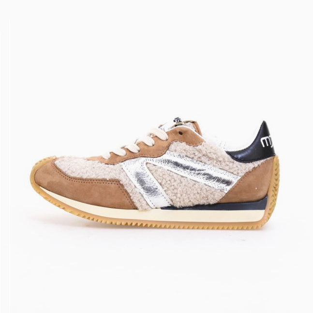 Deportiva de la marca Mjus. Fabricada con piezas de corte en color cuero, combina borreguito en color beige. Detalle metalizado en color plata en el lateral del modelo. Contrafuerte en color negro con marca al contraste. Piso tricolor. Suela de goma. Un modelo que destaca por su elegancia y glamour. Versátil y cómoda, diseño italiano y feminidad en un solo paso.