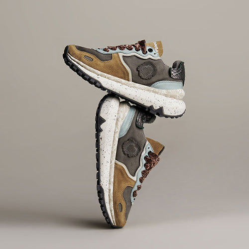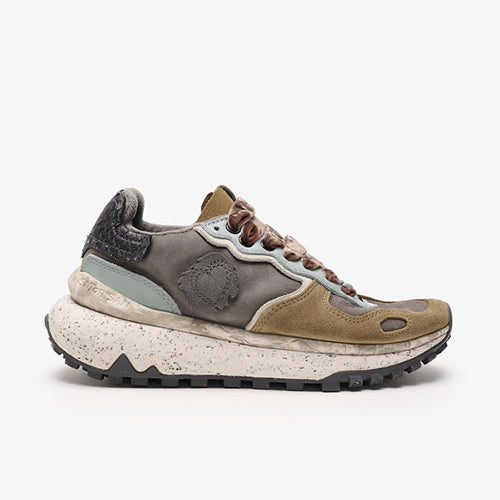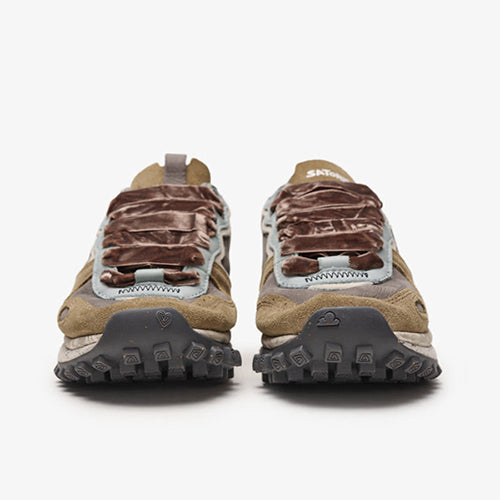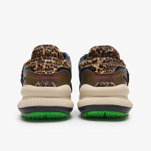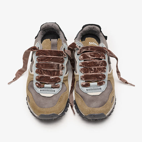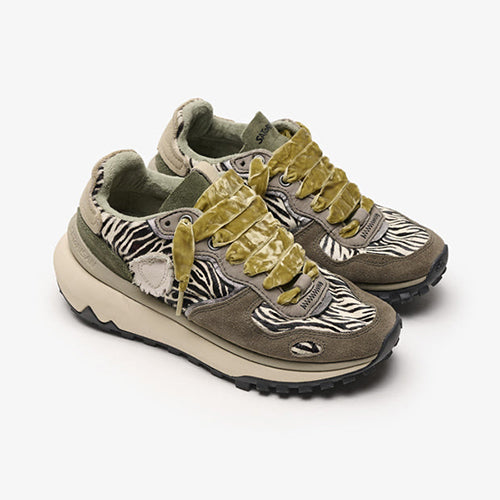 Deportiva de la marca Satorisan. Modelo reinterpretación Chacrona con nueva suela Metta Love, elaborado en contacto con la naturaleza gracias a sus materiales conscientes y de alta calidad, beneficiando a tus pies y al planeta. Diseño en animal print combinado colores gris, kaki y negro. Detalle de marca en la lengüeta y parte lateral posterior. Doble juego de cordones, uno en tencel color ocre y otro en algodón color beige.