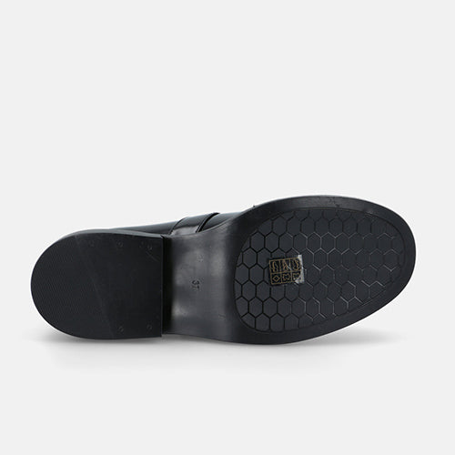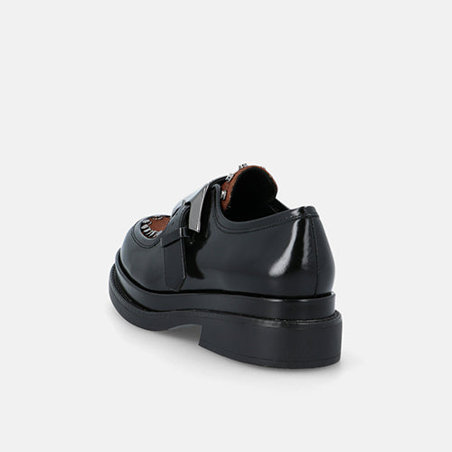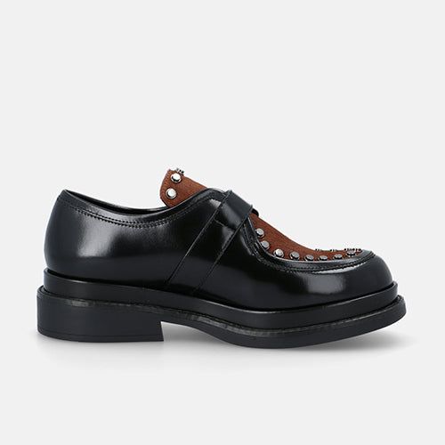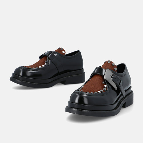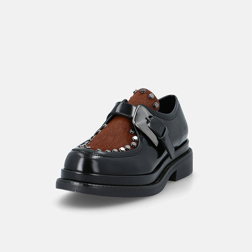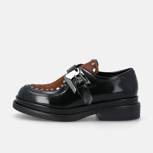 Zapato plano de la marca Elvio Zanon. Fabricado en piel brillante color negro, con original detalle en pelo de potro marrón. Su maxi hebilla lateral y los remaches metálicos que enmarcan la parte superior añaden un toque rockero y sofisticado, transformando un clásico modelo masculino en un calzado de aire femenino. El fondo sólido y ligeramente elevado asegura comodidad y estabilidad, haciéndolas perfectas para acompañar los looks urbanos más atrevidos. Un diseño con mucha personalidad, que realza cualquier outfit con una mezcla de elegancia rebelde y versatilidad metropolitana.