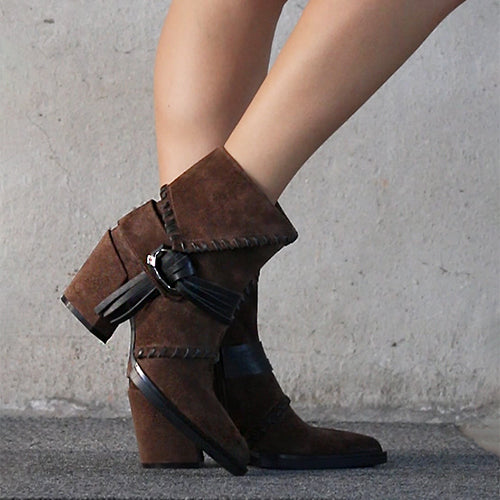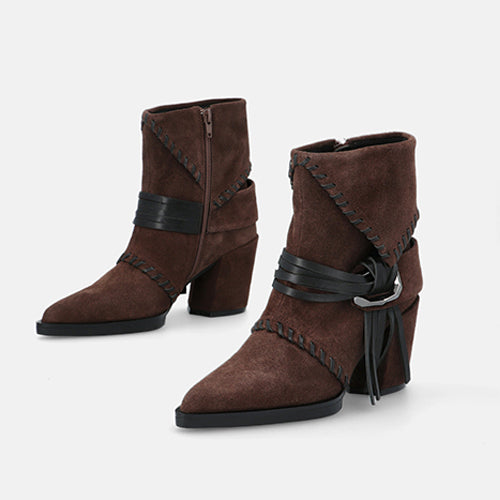 Botín de tacón alto de la marca Elvio Zanon. Fabricados en suave piel de ante en color marrón. Detalle de costuras decorativas tono sobre tono y una banda con flecos y hebilla geométrica que rodea el tobillo. Tacón ancho forrado al tono, muy estable y cómodo. Plantilla memory foam que garantiza un ajuste suave y confortable durante todo el día. Suela de goma.