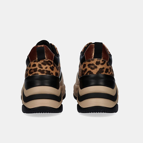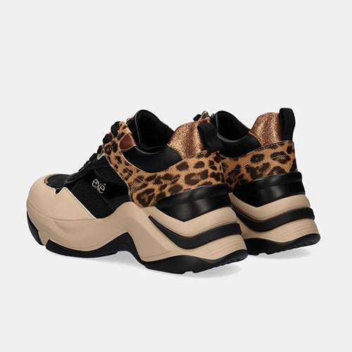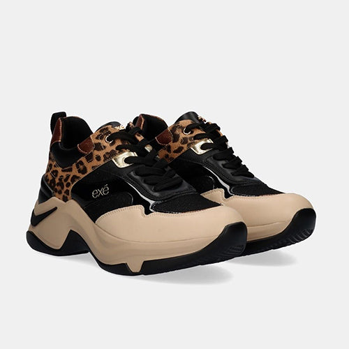 Zapato con suela volumen de la marca EXE. Corte y suela confeccionados en material sintético. Combina colores negro, beige y estampado animal print. Plantilla textil. Cierre mediante cordones. Piso grueso en bicolor beige y negro.