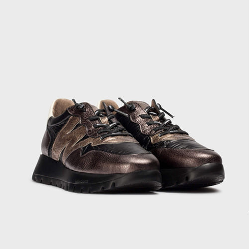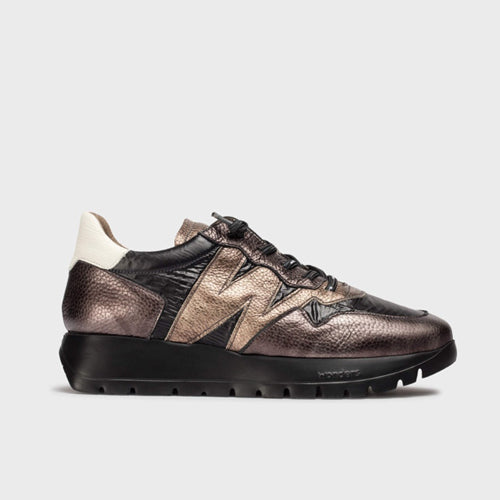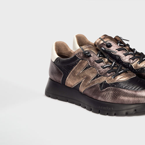 Zapato casual de la marca Wonders. Fabricado en combinación de piezas de corte en piel y textil en colores negro y estaño. Contrafuerte en color blanco. Diseño cómodo y en tendencia, con detalle de logo en el lateral exterior en color bronce. Cierre mediante cordones elásticos logotipados. Su suela desarrollada con la tecnología WondersFly™ garantiza ligereza y confort. Plantilla interior de MemoryGel de gran comodidad.