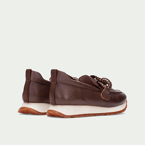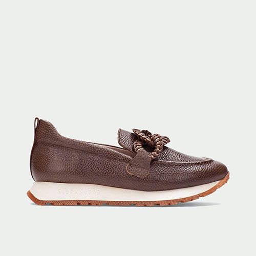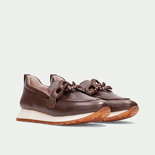 Mocasín deportivo de la marca Hispanitas. Fabricado en piel grabada color cuero oscuro. Detalle de cadena forrada en piel sintética. Puntera redondeada. Piso de 3 cm compuesto de goma termoplástica. Forro interior de origen no animal, 100% transpirable y termorregulador.