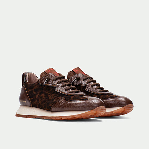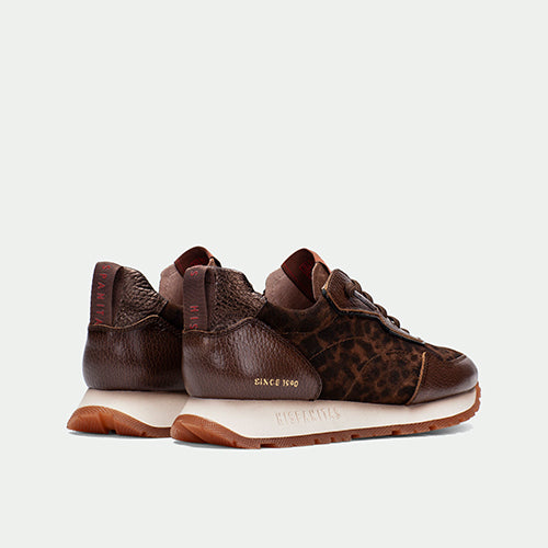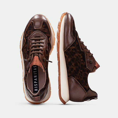 Zapato casual de la marca Hispanitas. Modelo deportivo con cordones elásticos. Se incluye otro par de cordones de algodón. Piso de 3 cm de goma termoplástica. Elaborado en piezas de corte en piel cuero oscuro combinado con serraje de estampado animal. Forro interior de origen no animal, 100% transpirable y termorregulador.