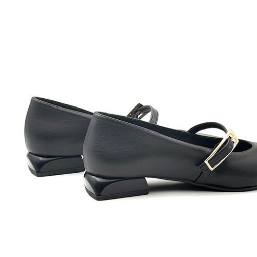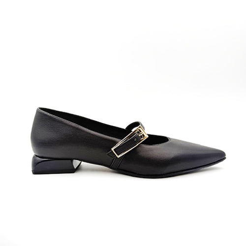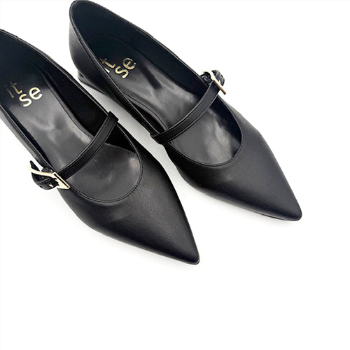 Zapato estilo merceditas de la marca ITSE. Fabricado en piel color negro. Detalle de tira con hebilla plateada en el empeine para un mayor ajuste. Modelo en punta con escote redondeado. Tacón bloque al tono. Suela de goma.