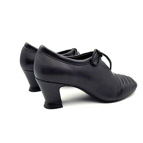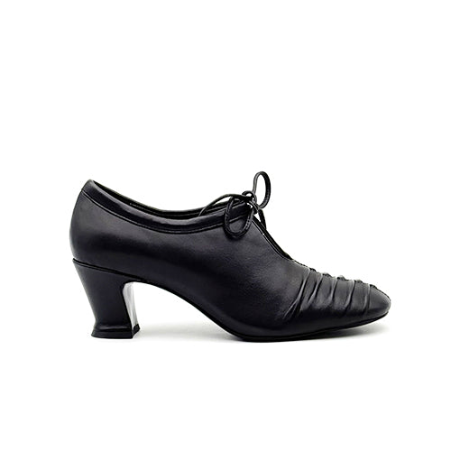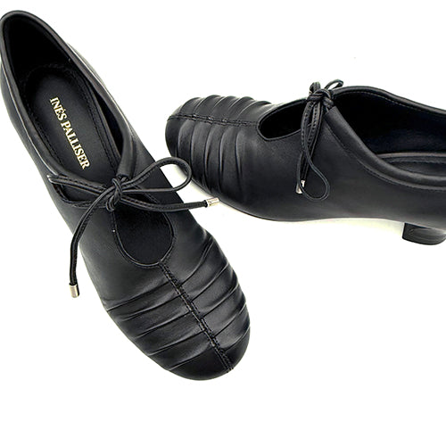 Zapato de la marca Inés Palliser. Fabricado en piel color negro. Modelo de puntera redondeada. Cierre mediante lazada de piel al tono. Tacón ancho de altura media. Original detalle de efecto corrugado en la parte frontal.