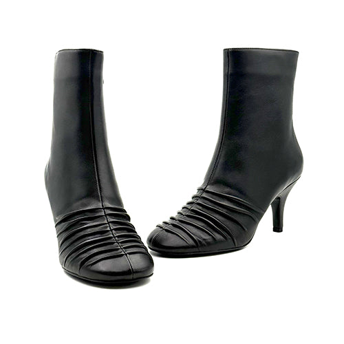 Botín de la marca Inés Palliser. Fabricado en piel color negro. Modelo de puntera redondeada. Cierre mediante cremallera situada en la parte lateral interior. Tacón fino. Original detalle de efecto corrugado en la parte frontal.