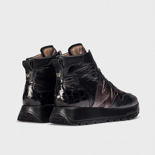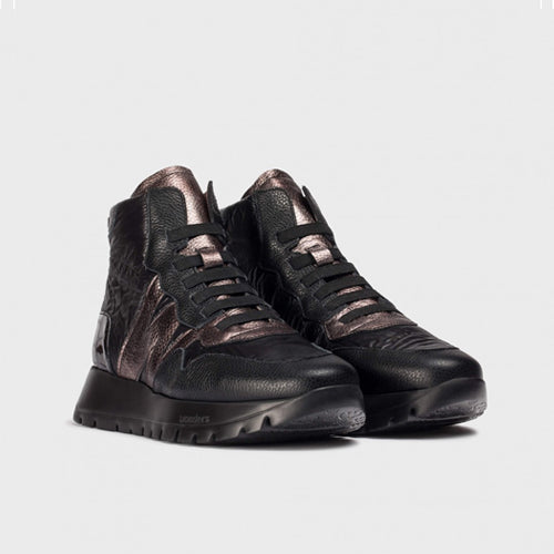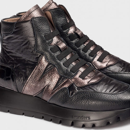 Botín casual de la marca Wonders. Fabricado en combinación de piezas de corte en piel y textil en color negro. Diseño cómodo y en tendencia, con detalle de logo en el lateral exterior en color estaño. Cierre mediante cordones elásticos logotipados. Su suela desarrollada con la tecnología WondersFly™ garantiza ligereza y confort. Plantilla interior de MemoryGel de gran comodidad.