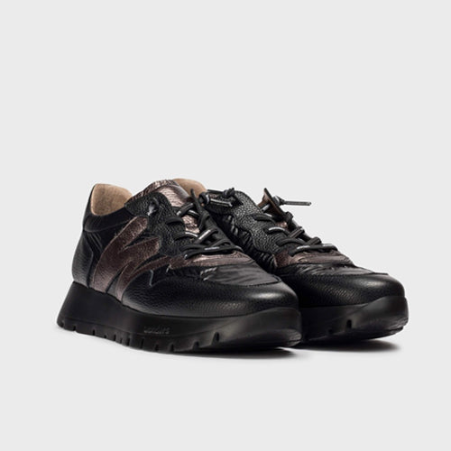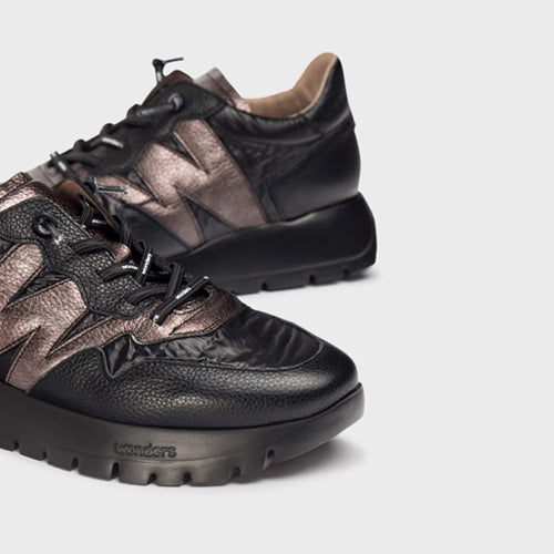 Zapato casual de la marca Wonders. Fabricado en combinación de piezas de corte en piel y textil en color negro. Diseño cómodo y en tendencia, con detalle de logo en el lateral exterior en color estaño. Cierre mediante cordones elásticos logotipados. Su suela desarrollada con la tecnología WondersFly™ garantiza ligereza y confort. Plantilla interior de MemoryGel de gran comodidad.