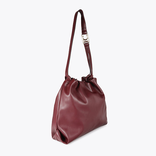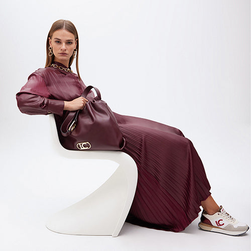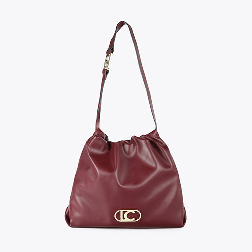 Bolso de la marca Lola Casademunt. Confeccionado en material sintético efecto piel en color burdeos. Incorpora el distintivo logo LC de diseño ovalado en tono dorado. Asa para colgar al hombro al tono con detalle de marca. Interior espacioso y cierre fruncido con botón magnético, Un modelo perfecto para el día a día.