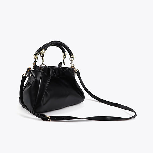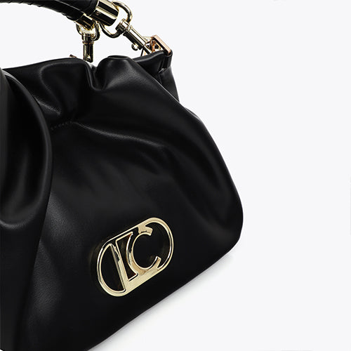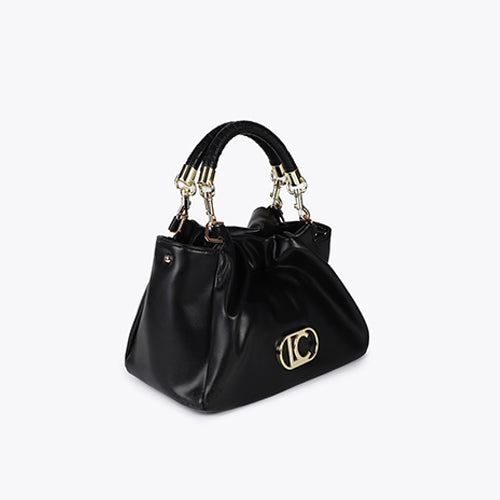 Bolso estilo judas de la marca Lola Casademunt. Modelo en efecto piel color negro. Detalle de logo ovalado en metálico color dorado situado en la parte frontal. Doble asas trenzadas extraíbles. Bandolera ajustable y extraíble al tono. Cierre magnético. Interior con departamento con cremallera. Pequeño bolsillo interior con cremallera.