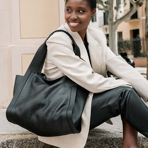 Shopper de la marca Biba. Fabricado en piel color negro. Muy ligero. Cierre con cremallera. Bolsillo interno. Llavero anclado al interior del bolso. Sin forro.