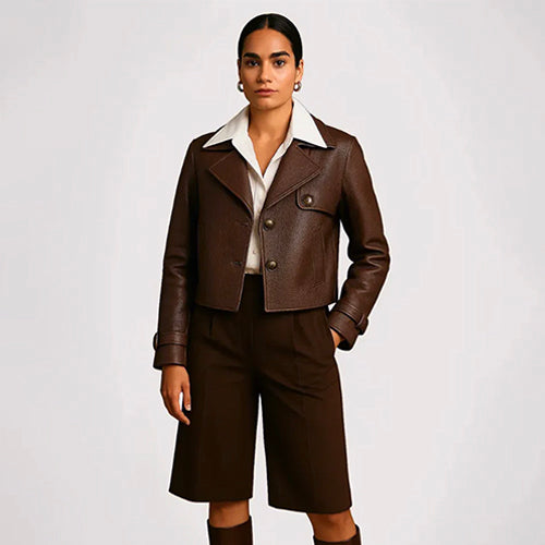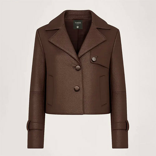 Chaqueta de la marca Torras en color marrón. Confeccionada en piel auténtica con acabado grabado, que aporta textura y un estilo natural y sofisticado. De corte recto y largo cropped, incorpora solapas clásicas, cierre frontal con botones de piel a tono y bolsillos discretos. Los detalles de hebillas en las mangas refuerzan su carácter contemporáneo.