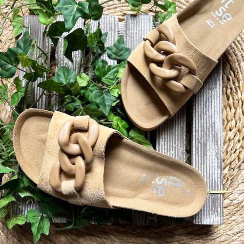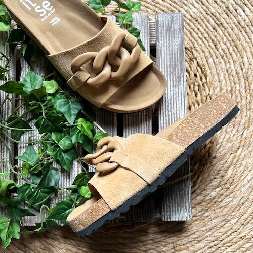 Sandalia tipo pala de la marca ITSE. Modelo de tira ancha en color nobuk camel. Detalle de cadena eslabón en material tipo resina al tono. Piso en material tipo corcho. Plantilla acolchada para una mayor comodidad en la pisada. Suela de goma.