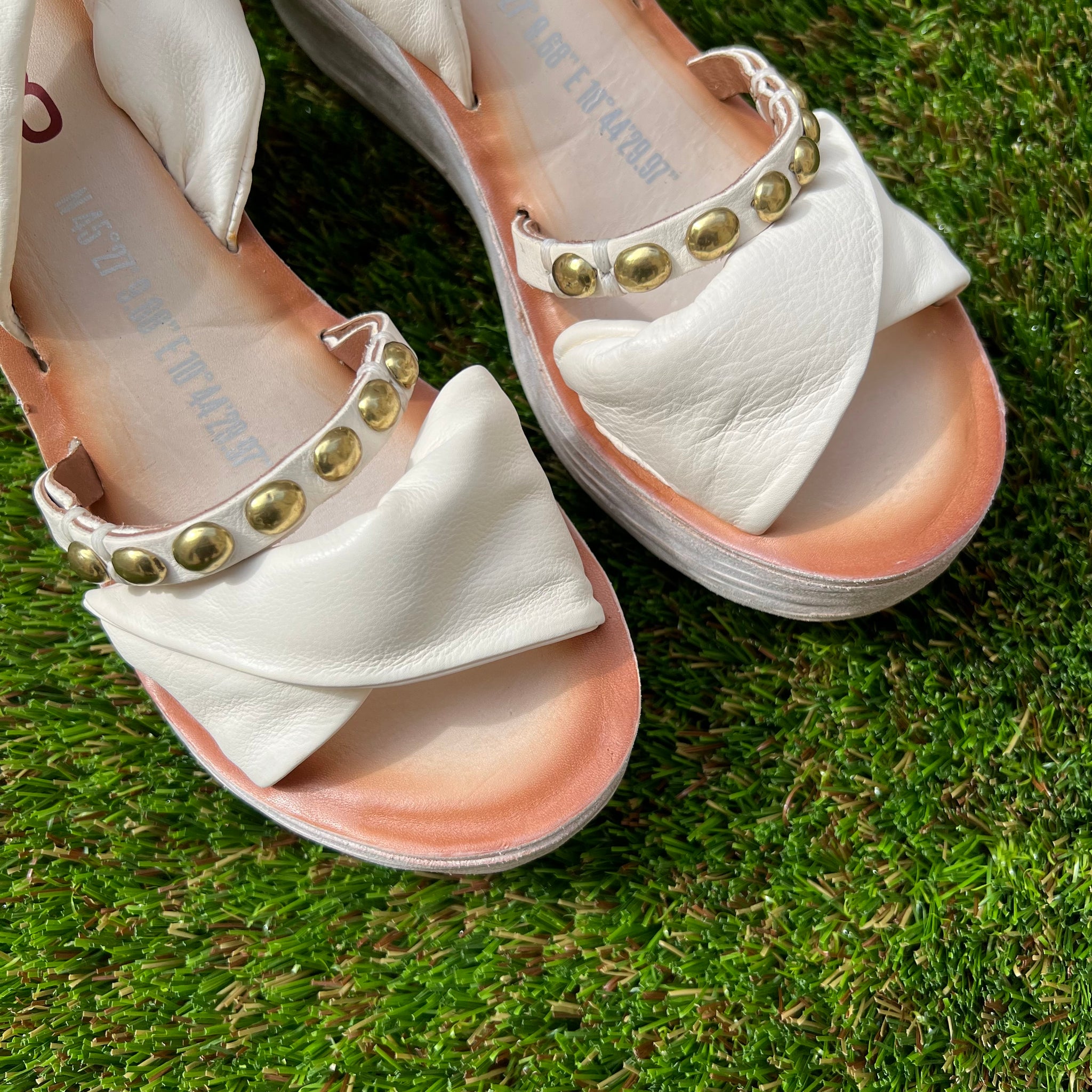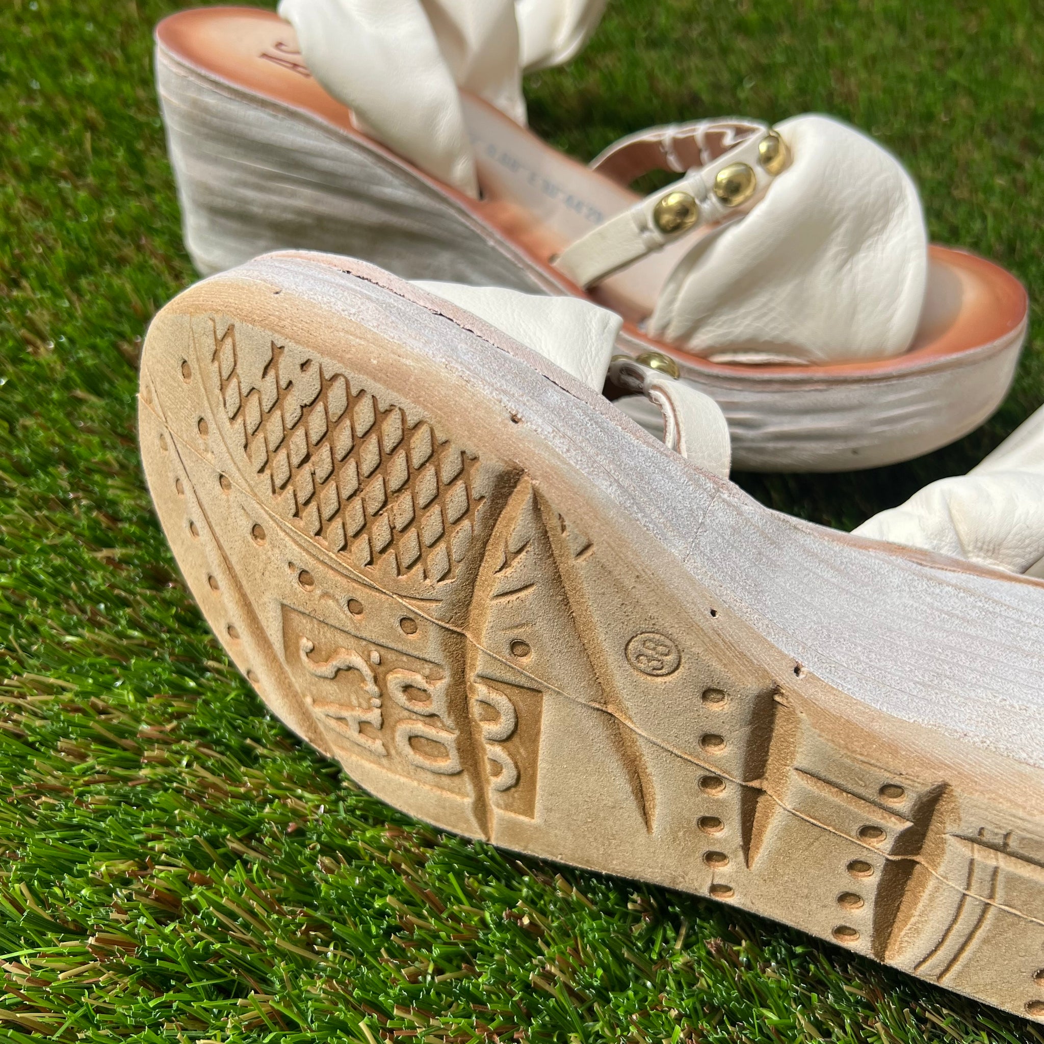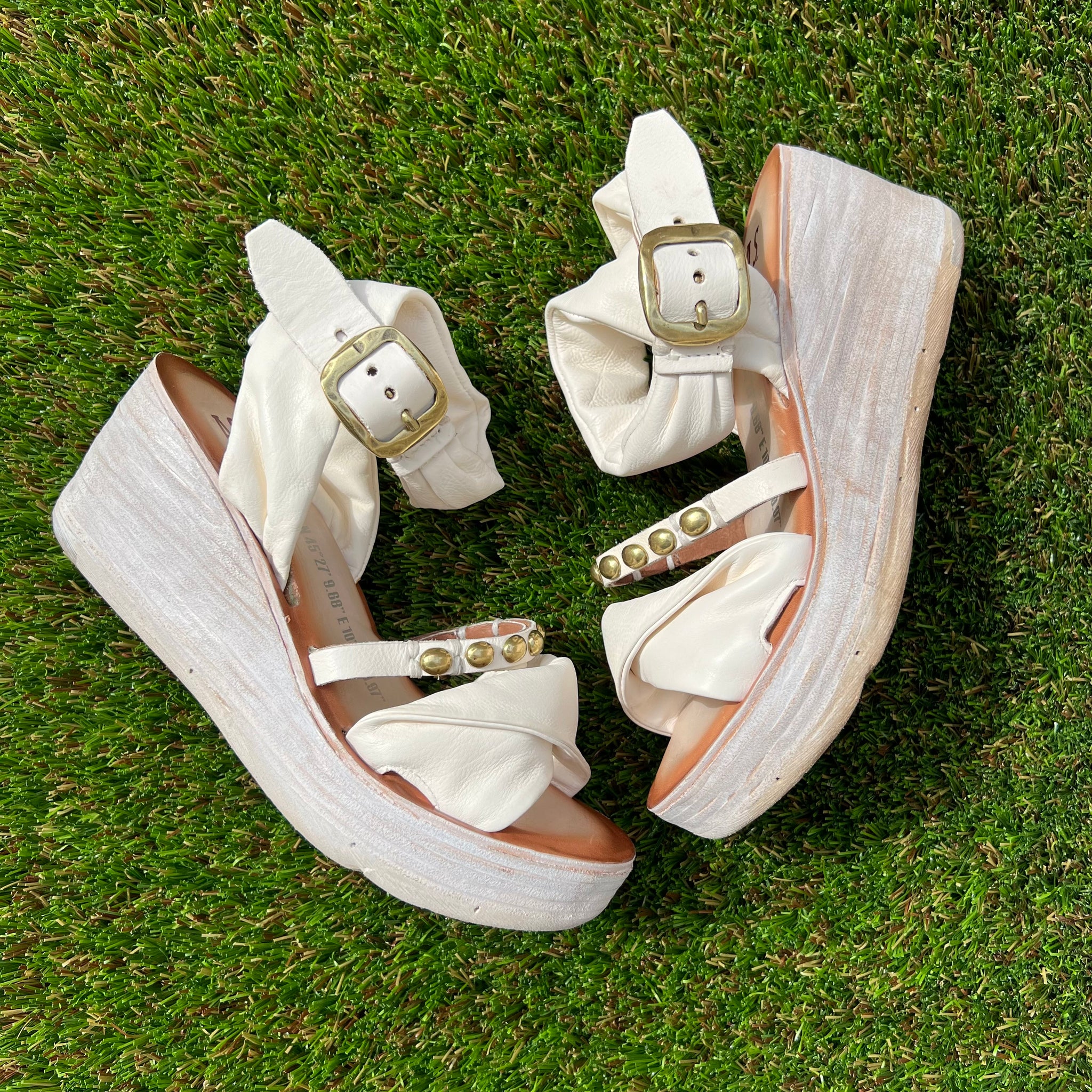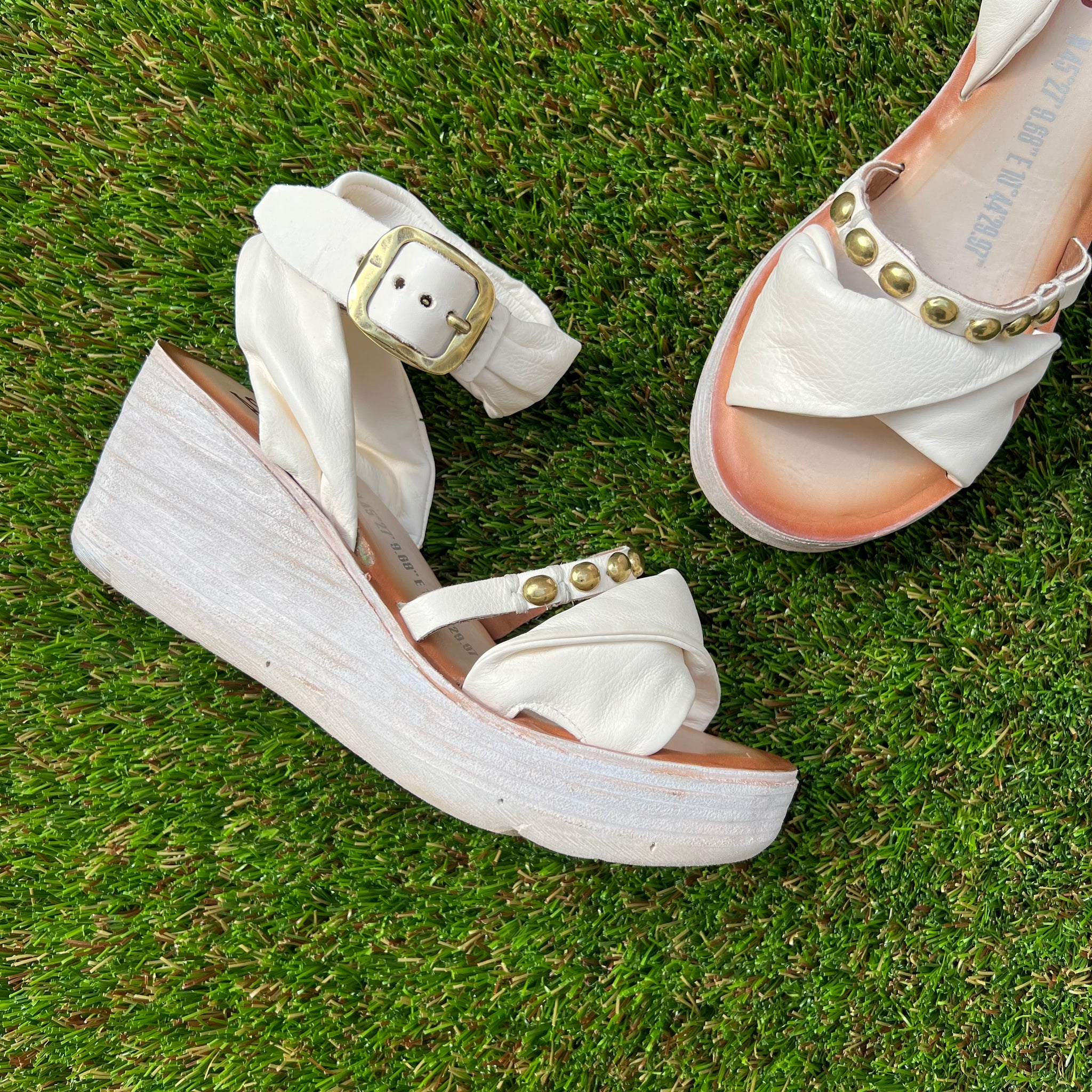 Sandalia de plataforma y cuña de la marca AS98. Fabricada en piel color beige hielo. Modelo de tiras gruesas envolventes. Detalle de tachas en color dorado. Cierre mediante hebilla ajustable a la altura del tobillo. Plataforma y cuña en material estilo natural al tono. Suela de goma con grabado de logotipo de la marca.