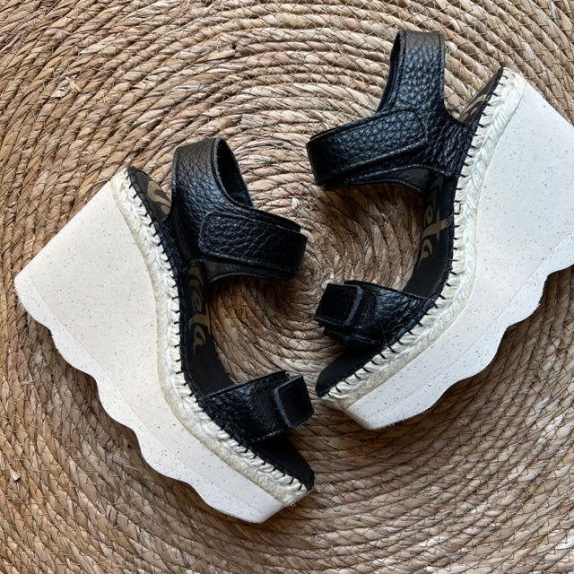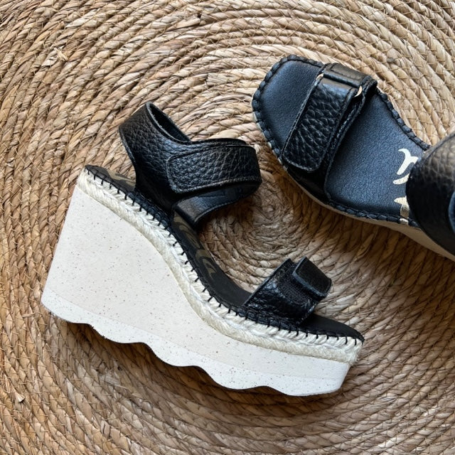 Sandalia con plataforma y cuña de la marca Vidorreta. Fabricada en piel color negro. Modelo de tiras con perfecto ajuste gracias a su sistema de velcro. Cerco de yute natural alrededor del modelo. Piso ligero en material tipo caucho en color beige y detalle de picado al tono.