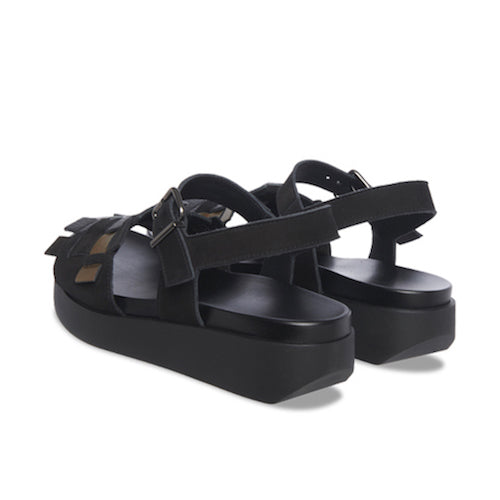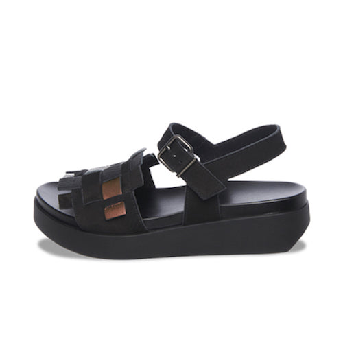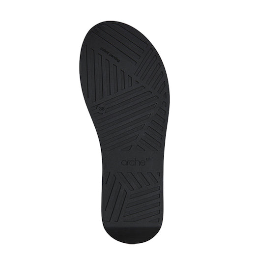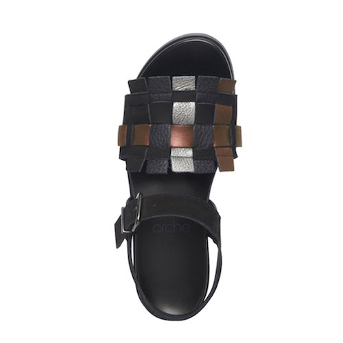 Sandalias trenzadas con cuña de la marca Arche. Fabricadas en combinación de piel y nobuk. Modelo multicolor en tonalidad negro, castaño y gris metalizado. Cierre mediante hebilla ajustable a la altura del tobillo. Plantilla anatómica "reposapiés" en color negro. Suela de goma con cuña en color negro.