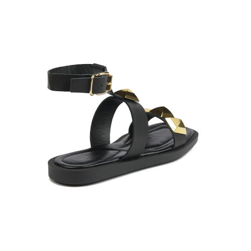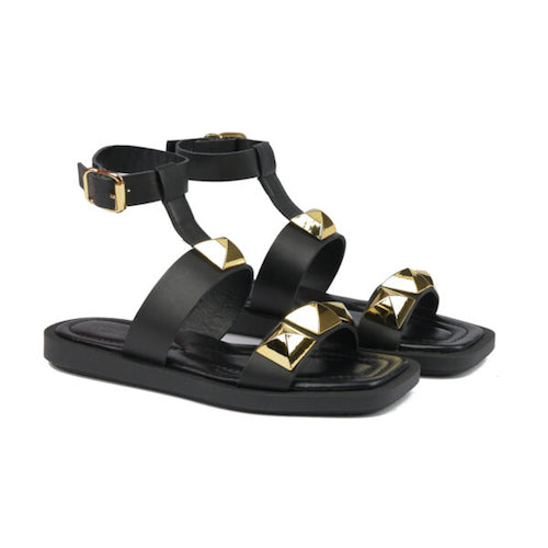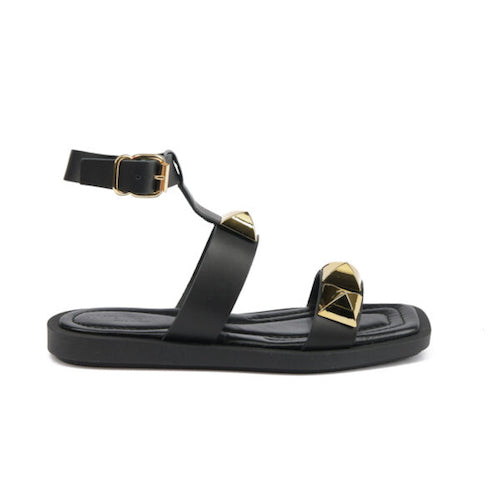Sandalia plana de tiras de la marca JANET&JANET. Fabricadas en piel suave color negro. Detalle de tachuelas maxi piramidales doradas. Cierre mediante hebilla ajustable a la altura del tobillo.