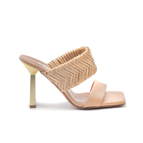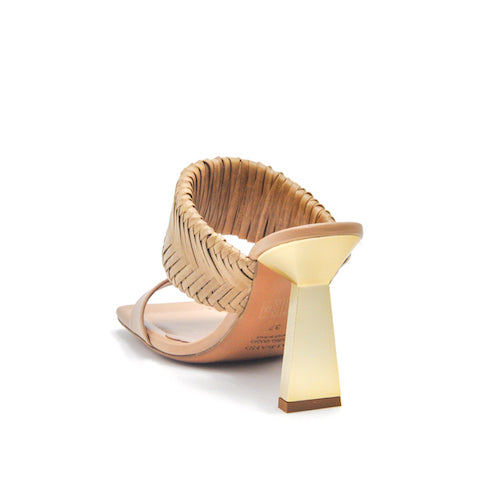 Sandalia con tacón alto de la marca Albano. Fabricada en piel color nude. Modelo destalonado de doble tira. Tira superior ancha de piel trenzada que permite una perfecta sujeción. Tacón fino, recto y plano, en forma de trapecio, color dorado.