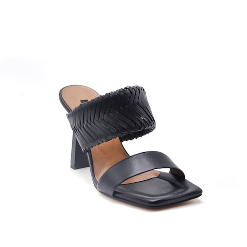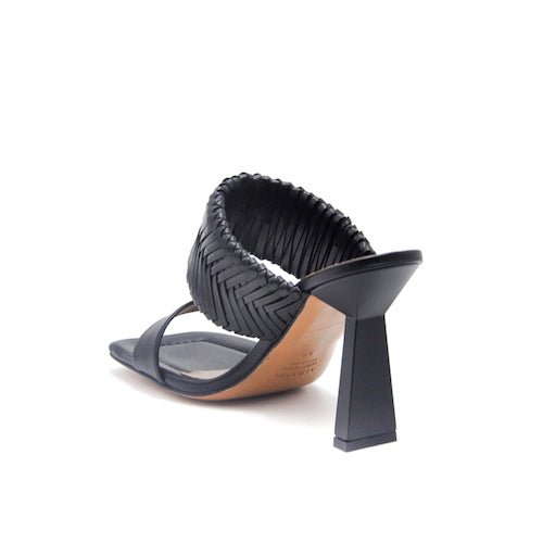 Sandalia con tacón alto de la marca Albano. Fabricada en piel color negro. Modelo destalonado de doble tira. Tira superior ancha de piel trenzada que permite una perfecta sujeción. Tacón fino, recto y plano, en forma de trapecio, color negro.