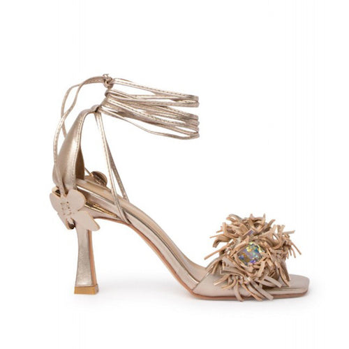 Sandalia de tacón alto de la marca Alma en pena. Fabricada en piel metalizada color bronce. Tira delantera adornada con flecos y pedrería. Tiras envolventes al tobillo con detalle de mariposas en el extremo final. Plantilla acolchada de piel. Altura tacón: 8 cm. aprox.