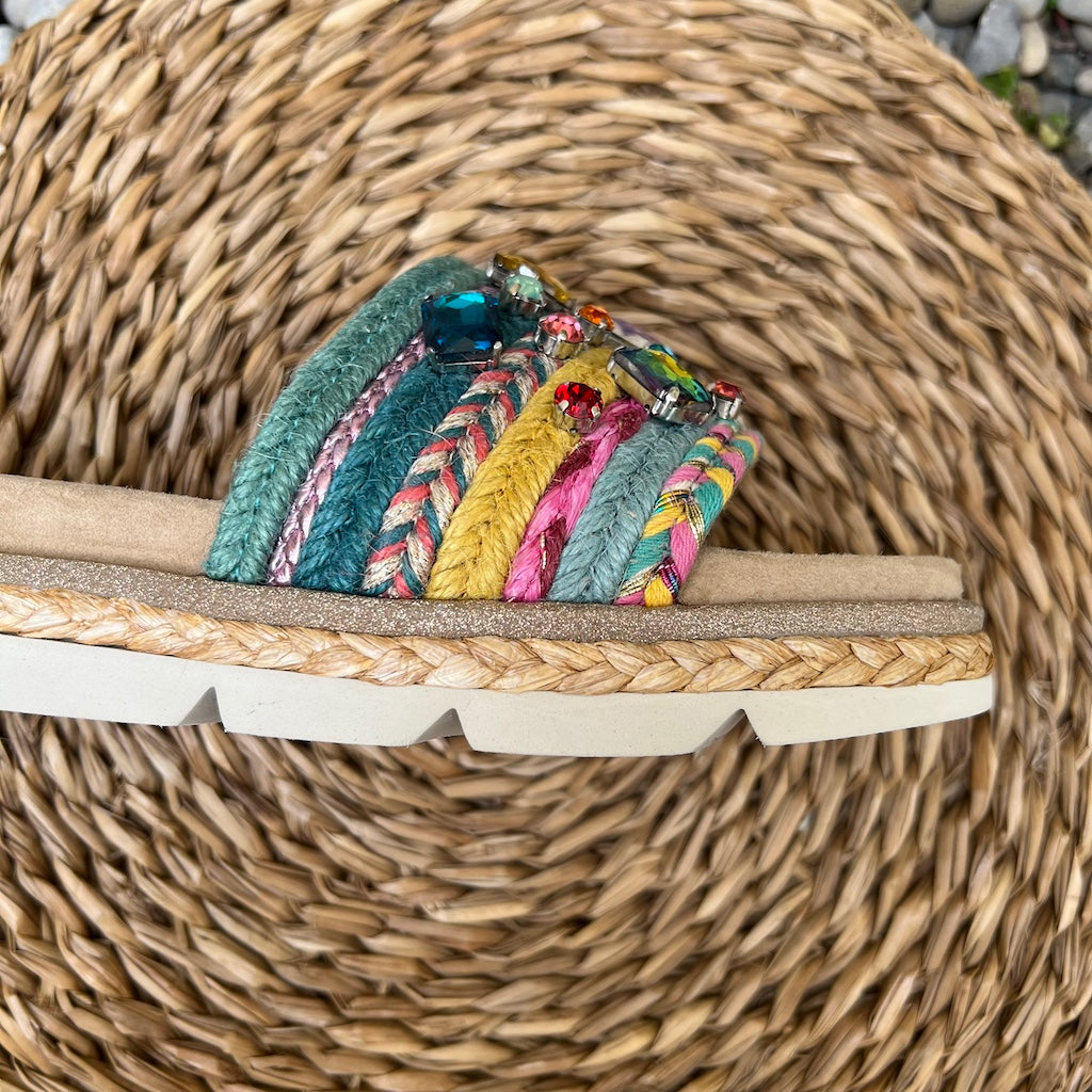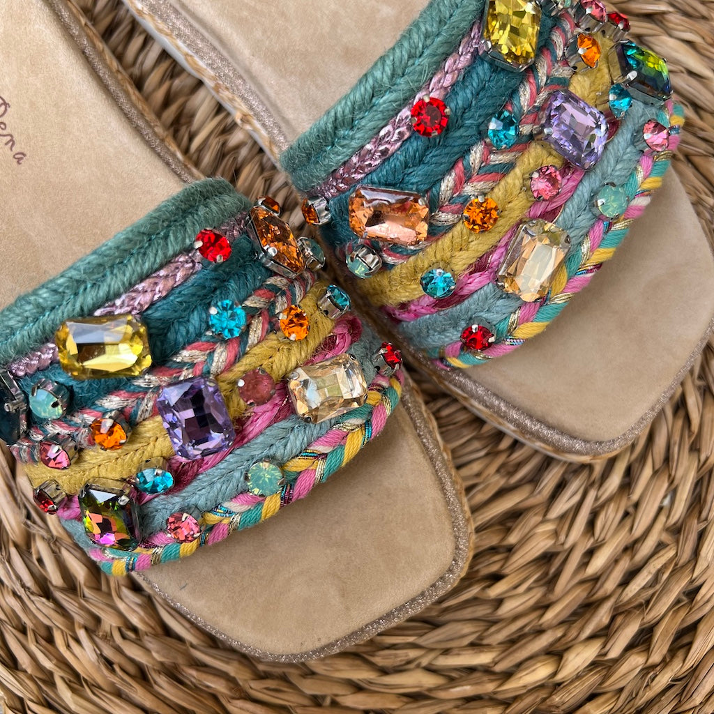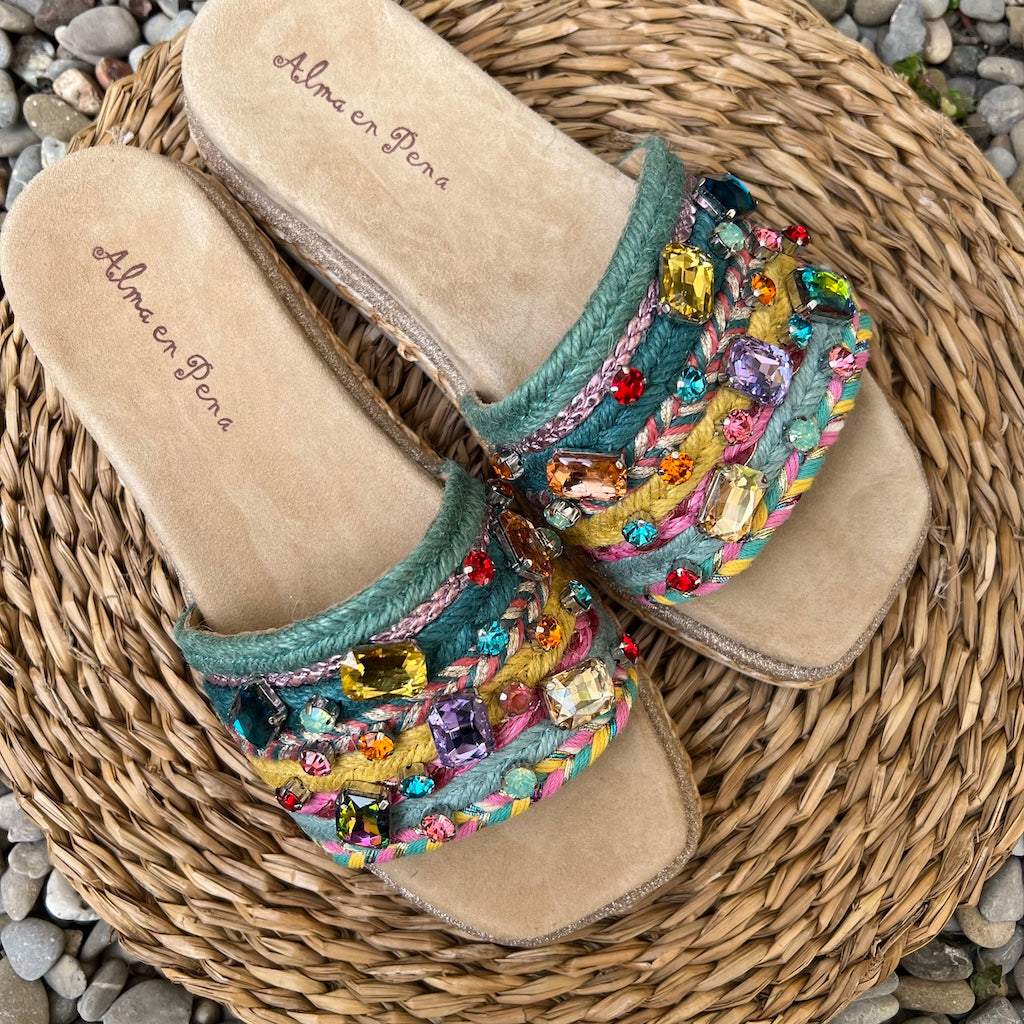 Sandalia estilo pala de la marca Alma en Pena. Fabricada en material esparto en multicolor con piezas de strass en diferentes tamaños. Suela de goma antideslizante.
