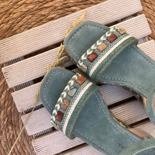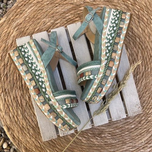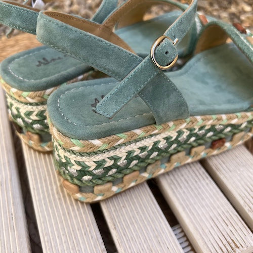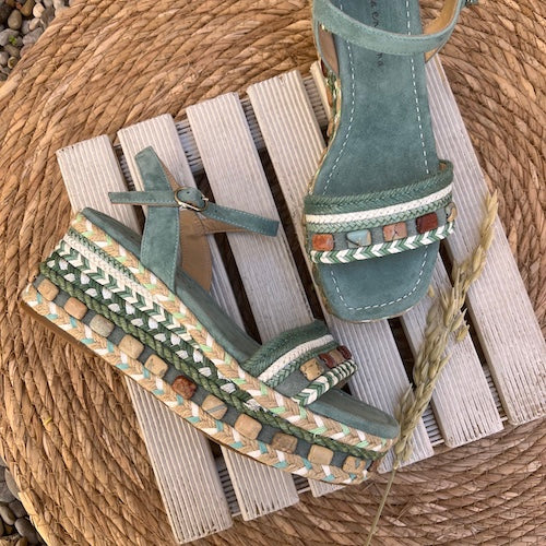 Sandalia con plataforma de la marca Alma en Pena en color aguamarina. Modelo con detalle de trenzado y piedras naturales en plataforma y tira delantera. Cierre con hebilla ajustable. Plantilla acolchada de piel. Un modelo muy veraniego y representativo de la firma.