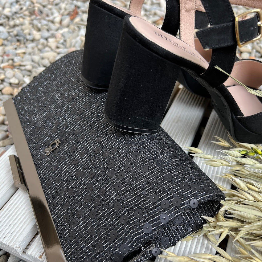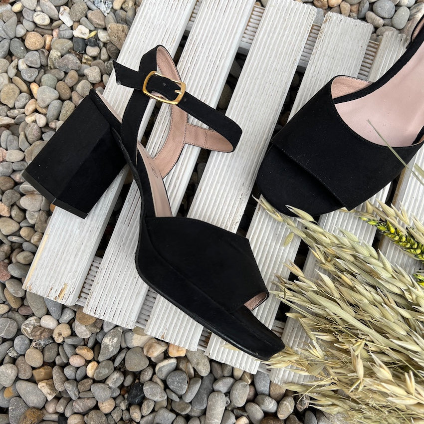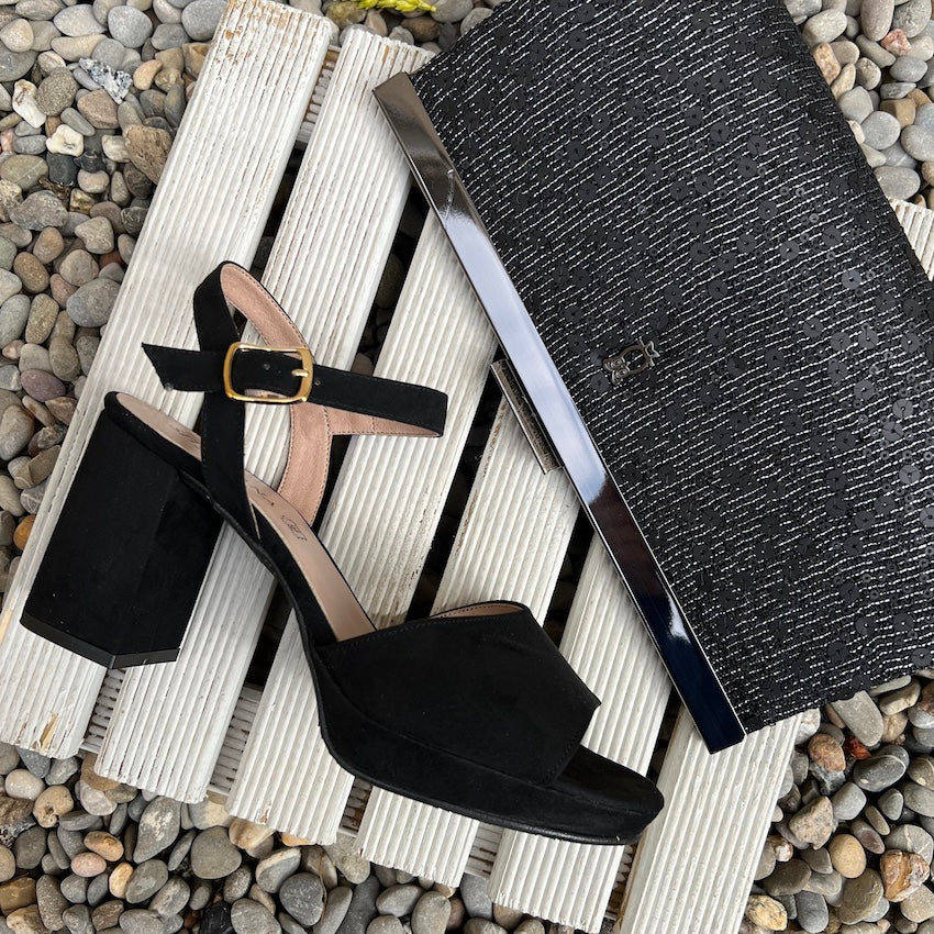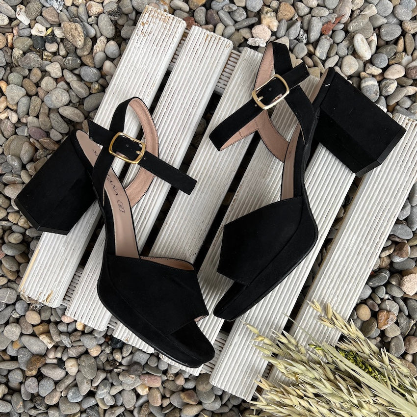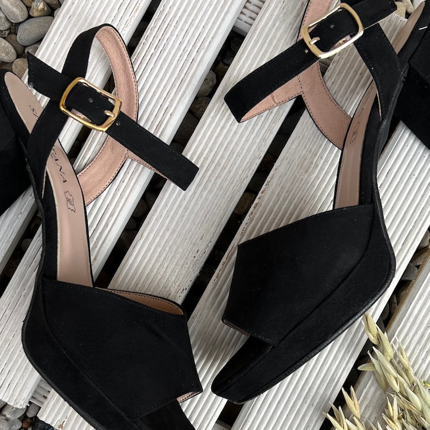 Sandalia con plataforma y tacón medio de nuestra Colección Sitgetana. Diseño en color negro con tira ancha en su parte delantera. Cierre mediante hebilla ajustable a la altura del tobillo. Plataforma y tacón amplio forrado al tono.