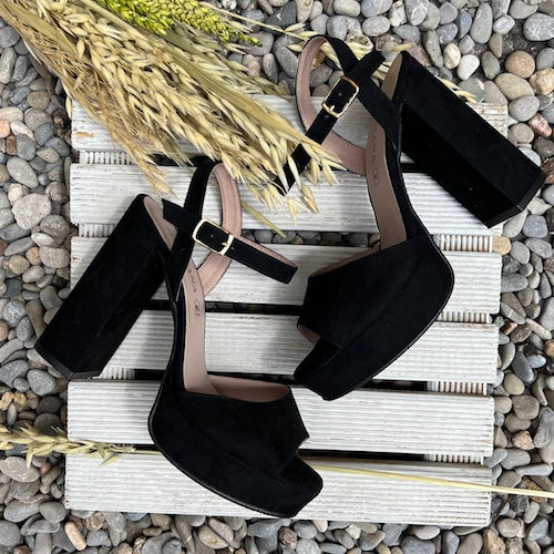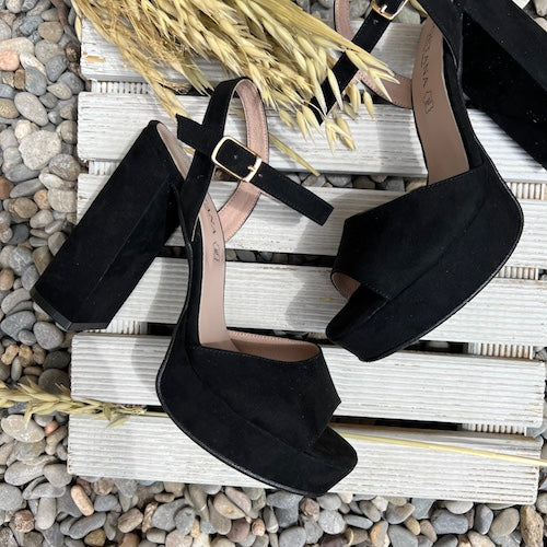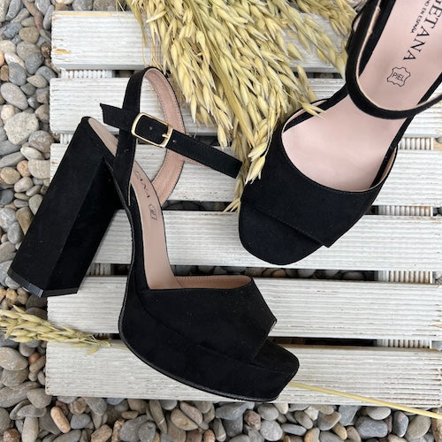 Sandalia con plataforma y tacón alto de nuestra Colección Sitgetana. Diseño en color negro con tira ancha en su parte delantera. Cierre mediante hebilla ajustable a la altura del tobillo. Plataforma y tacón amplio forrado al tono.