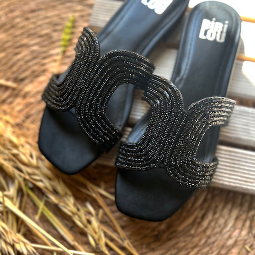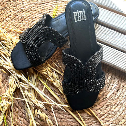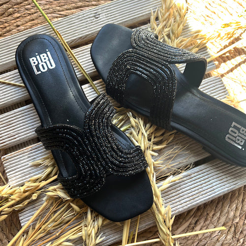 Sandalia plana estilo pala de la marca Bibi Lou. Empeine de strass en color negro. Forro y plantilla de piel. Modelo de punta cuadrada con tacón tipo bloque forrado al tono.
