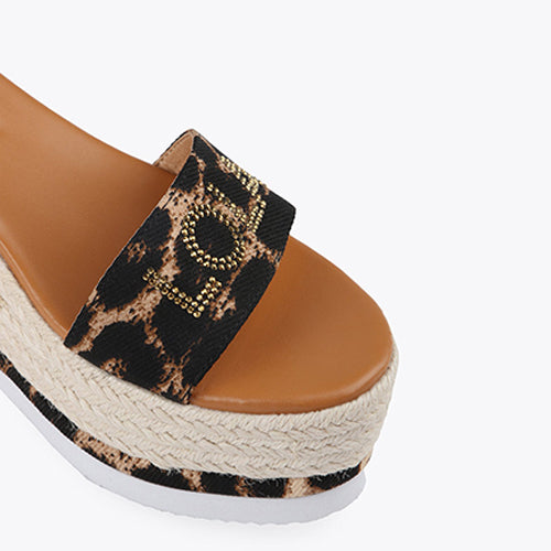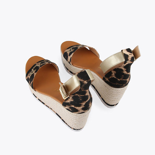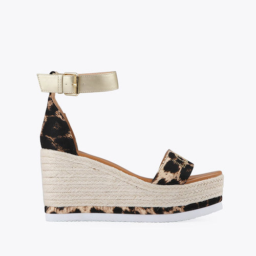 Sandalia de plataforma y cuña de la marca Lola Casademunt. Fabricada en combinación de esparto, material textil en animal print. Detalle de marca en strass al tono. Cierre mediante tira en color metalizado oro con hebilla ajustable a la altura del tobillo.