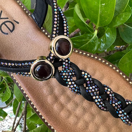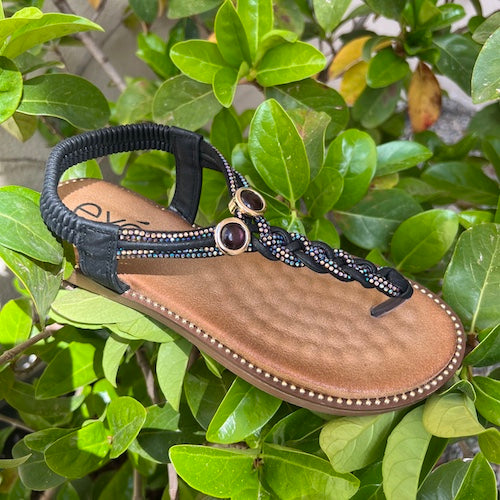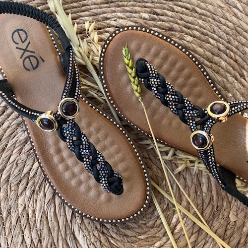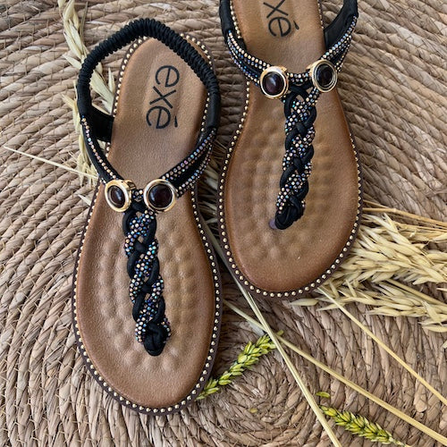Sandalia plana de la marca Exe en color negro. Tira de entrededo combinando strass multicolor y textil en negro, acabada con dos botones al tono en el empeine. Plantilla de antelina para una pisada suave y confortable. Goma elástica en la parte posterior del modelo para un ajuste perfecto.