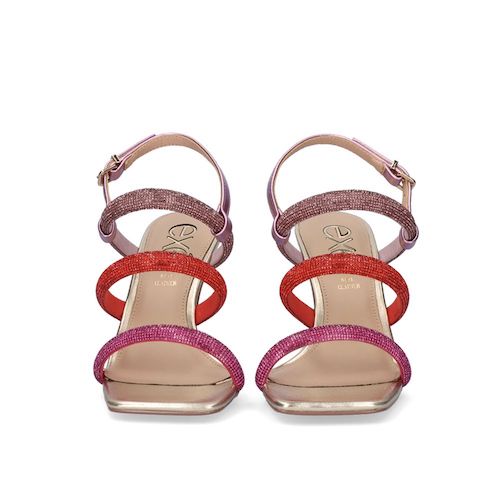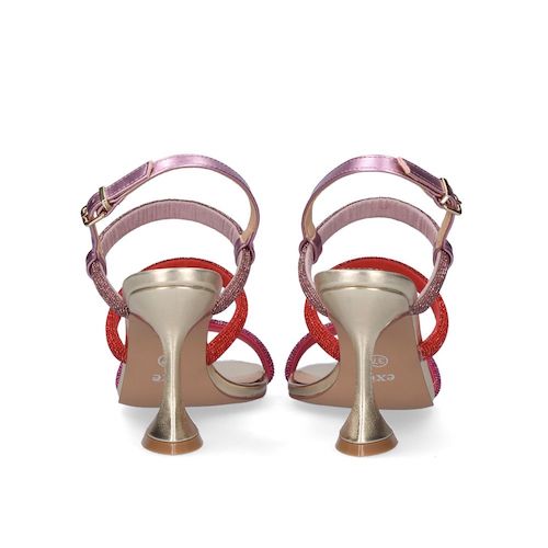 Sandalia de tiras con tacón de la marca EXE. Fabricada en material sintético con plantilla de piel y suela de goma. Diseño minimalista en color gold, compuesto por 3 tiras brillantes a lo largo del empeine en colores fucsia, rojo y malva. Tacón de base cuadrada forrado al tono. Cierre mediante tira trasera con hebilla ajustable.