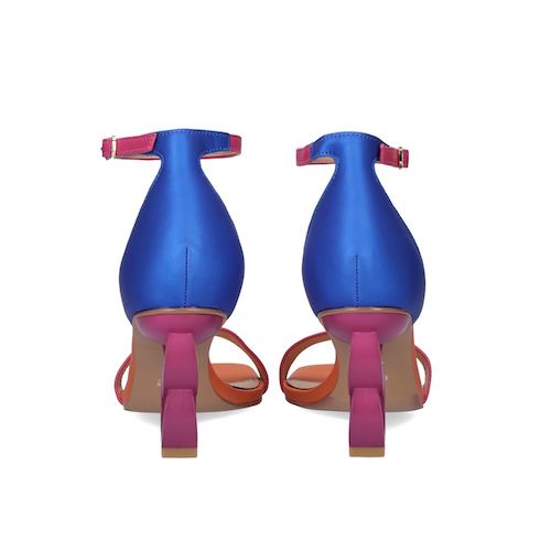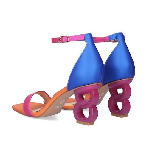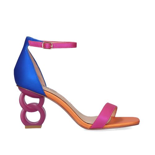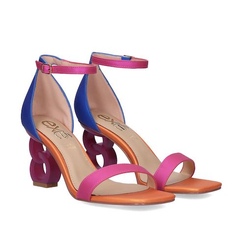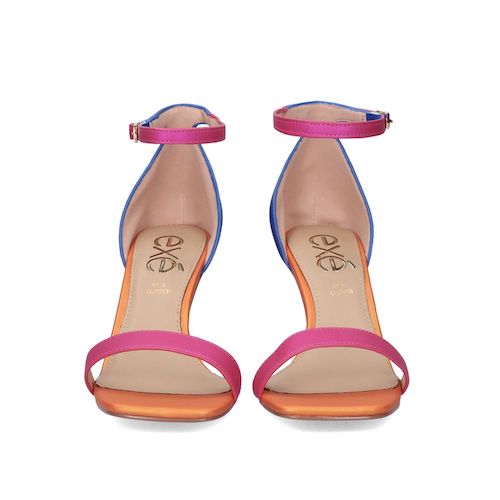 Sandalia de tacón de la marca EXE. Fabricada en material sintético, combina colores fucsia, azul y naranja. Cierre mediante tira con hebilla ajustable a la altura del tobillo. Destaca su original tacón fucsia de formas circulares. Plantilla de piel y suela de goma.