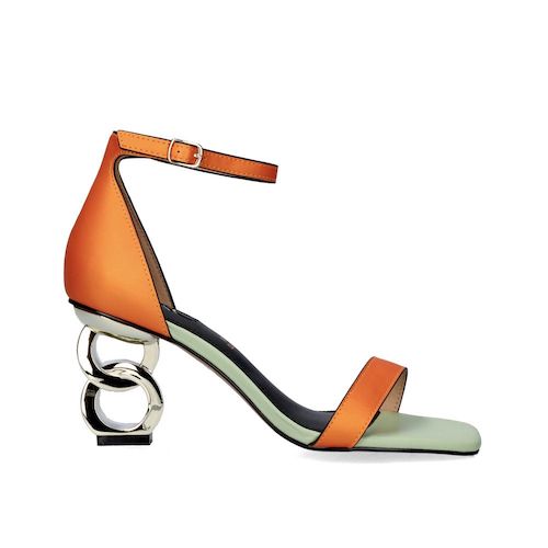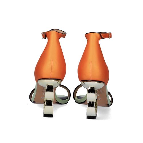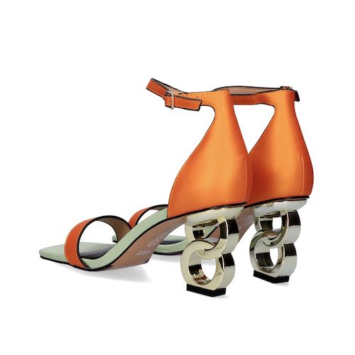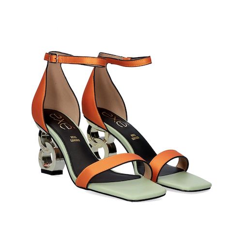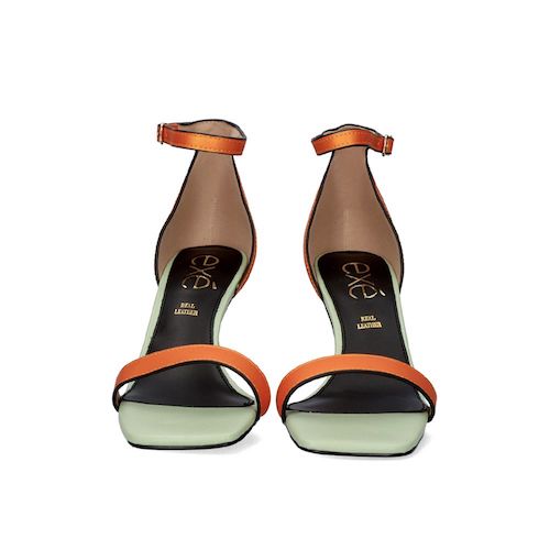 Sandalia de tacón de la marca EXE. Fabricada en material sintético, combina colores verde y naranja. Cierre mediante tira con hebilla ajustable a la altura del tobillo. Destaca su original tacón dorado de formas circulares. Plantilla de piel.