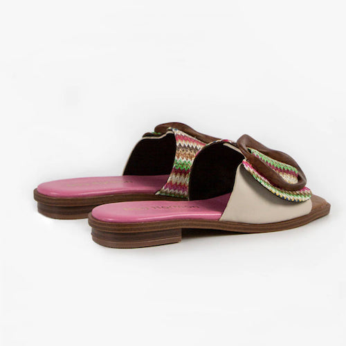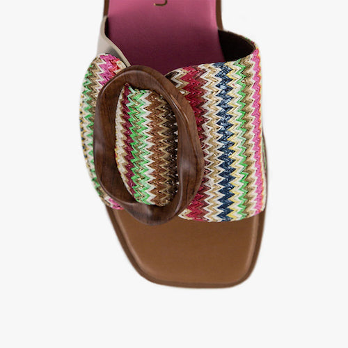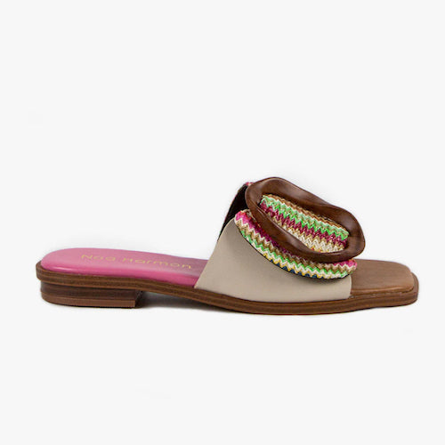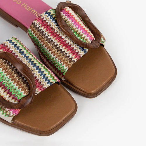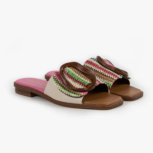 Sandalia plana de la marca Noa Harmon. Estilo pala de rafia multicolor. Modelo en napa vegana color piedra con hebilla ovalada efecto madera. Forro y plantilla de piel. Suela de goma. Diseñada bajo tecnología NOA FEELS GOOD que te hará sentir en las nubes con cada pisada brindándote la máxima comodidad en el día a día.