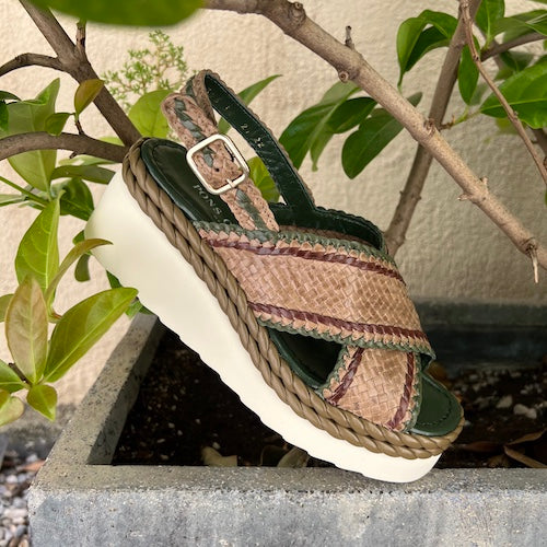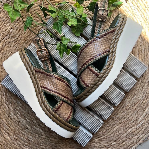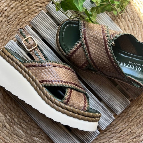 Sandalia de plataforma y cuña de la marca Pons Quintana. confeccionada en piel trenzada a mano color taupe. Detalles en color verde y burdeos. Tubular de efecto cuerda alrededor de plataforma. Cierre mediante tira con hebilla ajustable a la altura del tobillo. Suela de goma.