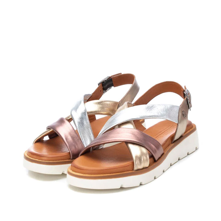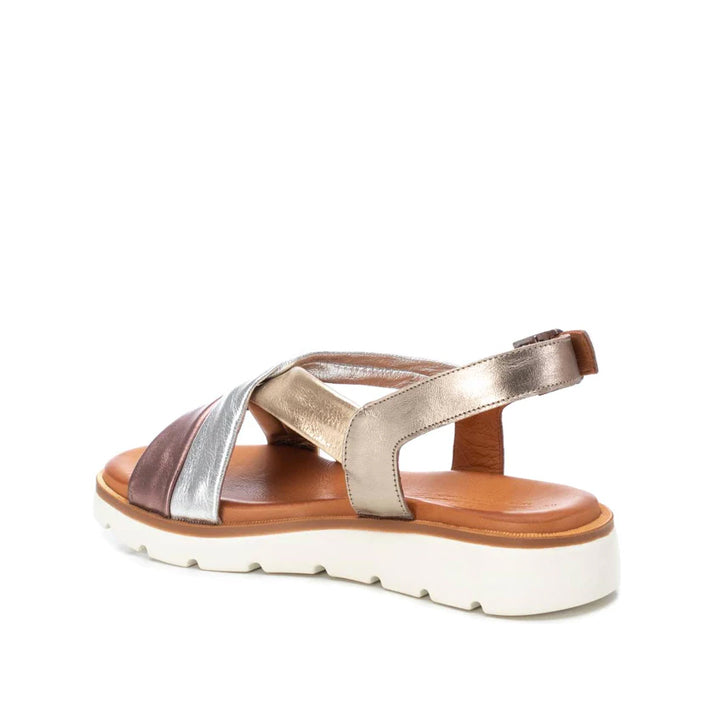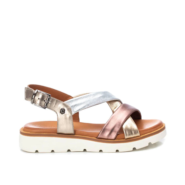 Sandalia plana de tiras de la marca Carmela. Fabricada en piel en acabado mate combinado con acabado metalizado. Cierre mediante correa con hebilla ajustable. Cómoda suela dentada de goma antideslizante.