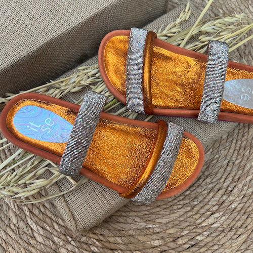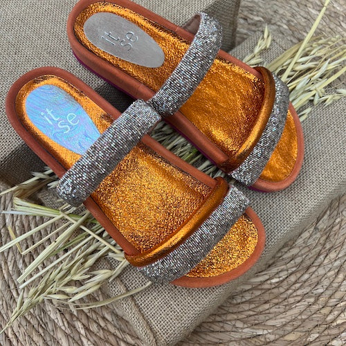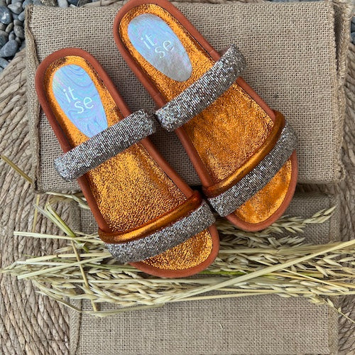 Sandalia plana de tiras de la marca Itse. Fabricada en piel color naranja acabado metalizado. Combinación de tira fina naranja con doble tira en color plata brillante efecto metalizado. Modelo estilo pala. Plantilla acolchada para una mayor comodidad. Suela de goma en color fucsia. Un modelo muy original y divertido para tus looks de verano.